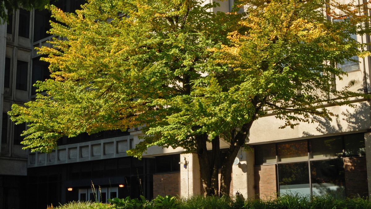 D’autres arbres remarquables poussent au côté de pavillons modernes. L’Université McGill continue ainsi à créer un capital d’arbres remarquables et à augmenter la biodiversité de son campus. Au pied du pavillon Stewart Biological Sciences, un arbre de Katsura (Cercidiphyllum japonica) et un métaséquoia de Chine (Metasequoia glyptostroboides) font partie d’une cour intérieure moderne assortie d’un jardin décoratif à la topographie ondulée et ornementé de massifs plantés. Les arbres ont été plantés en 1965 par Darnley Gibbs, professeur de botanique, à l’occasion de l’ouverture de ce pavillon moderne. On doit en partie leur conservation à l’encadrement bâti qui les entoure et les protège de grandes intempéries. Cette cour restreinte encadrée de hauts édifices se présente sous la forme d’un jardin traversé de sentiers avec des plates-bandes de vivaces et d’arbustes.