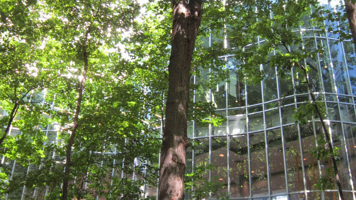 Inséré dans le flanc « Ouest » de l’édifice principal de HEC Montréal se trouve un caryer cordiforme de 68 cm de diamètre. Cet arbre domine cette portion du Boisé du Collège Jean-de-Brébeuf qui se trouve sur la propriété de HEC Montréal, et ce tant en raison de sa trentaine de mètres de hauteur que par l’envergure imposante de sa couronne. Ce caryer plus que centenaire s’est établi sur le flanc d’une pente rocheuse au sol mince. Son âge et l’abondante quantité d’érables à sucre qui l’entoure nous indique qu’il est le témoin de l’érablière à caryer cordiforme qui occupait ce secteur rocheux et au relief parfois prononcé autrefois.