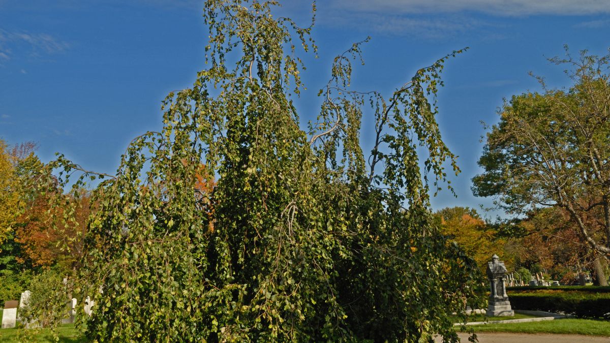 Une centaine d’espèces d’arbres, tel ce hêtre européen pleureur (Fagus sylvatica 'Pendula'), peuvent être observées dans le cimetière Mont-Royal qui se distingue comme étant un véritable arboretum.