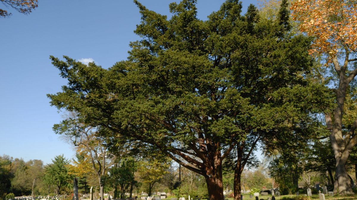 Cet if japonais (Taxus cuspidata) de plus de 60 ans témoigne d’un intéressant phénomène d’adaptabilité. Il a atteint le diamètre incroyable de 50 cm à hauteur de poitrine, ce qui en fait le plus gros de son espèce sur le mont Royal. Selon certains spécialistes, il serait le résultat de la fusion d’un plant mâle et d’un plant femelle par greffage. Un arbre de cette espèce atteint rarement 5 à 6 m de hauteur sous notre climat, alors que le spécimen du cimetière Mont-Royal mesure presque 15 m ! Il semble donc en excellente santé.