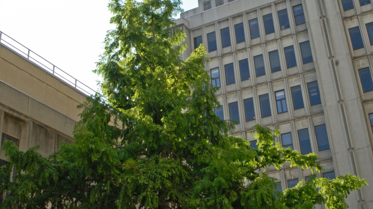 D’autres arbres remarquables poussent au côté de pavillons modernes. L’Université McGill continue ainsi à créer un capital d’arbres remarquables et à augmenter la biodiversité de son campus. Au pied du pavillon Stewart Biological Sciences, un arbre de Katsura (Cercidiphyllum japonica) et un métaséquoia de Chine (Metasequoia glyptostroboides) font partie d’une cour intérieure moderne assortie d’un jardin décoratif à la topographie ondulée et ornementé de massifs plantés. Les arbres ont été plantés en 1965 par Darnley Gibbs, professeur de botanique, à l’occasion de l’ouverture de ce pavillon moderne. On doit en partie leur conservation à l’encadrement bâti qui les entoure et les protège de grandes intempéries. Cette cour restreinte encadrée de hauts édifices se présente sous la forme d’un jardin traversé de sentiers avec des plates-bandes de vivaces et d’arbustes.