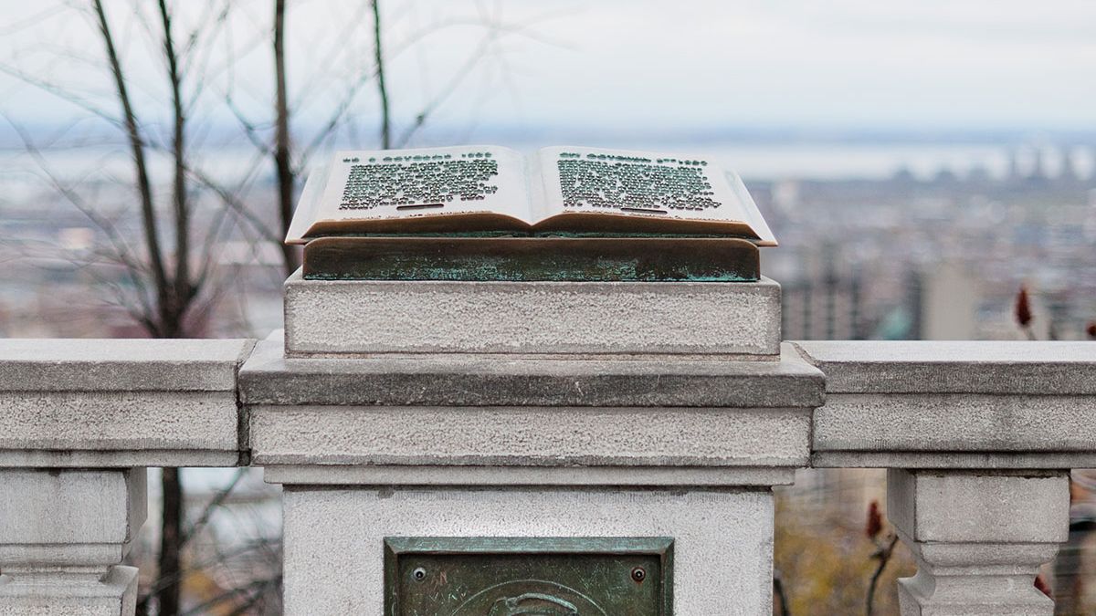 Monument commémoratif composé de deux plaques occupant un pilier du parapet du belvédère Kondiaronk. L’élément sur la partie supérieure du pilier est en forme de livre et contient un texte en relief. Celui sur la face avant du même pilier présente un portrait de Jacques Cartier.