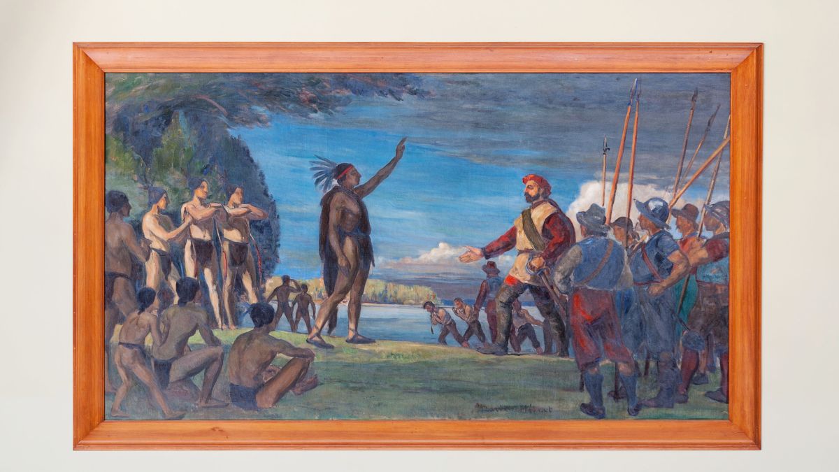 Huile sur toile représentant le face-à-face entre Jacques Cartier et les Iroquois avec à gauche, les Amérindiens et à droite les Français. Précédant son groupe, le chef des Iroquois dresse le bras en signe de bienvenue alors que Cartier lui répond en élevant légèrement le sien tout en gardant l’autre main sur la poignée de son épée. Derrière lui, les hommes portent bien haut leurs lances. Au loin, le ciel s’obscurcit.